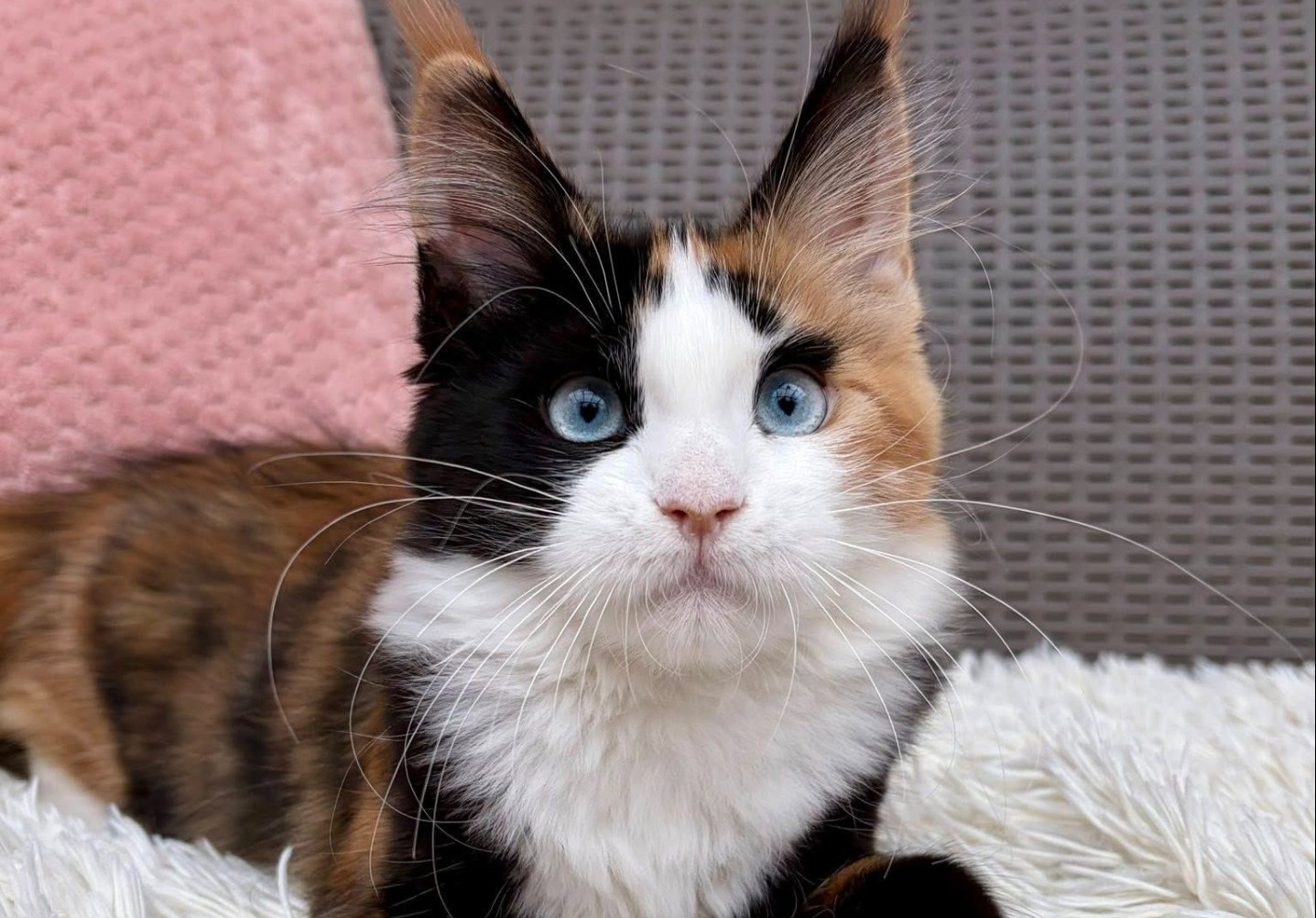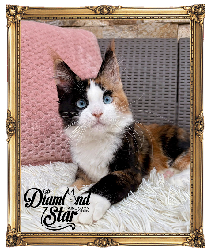Color: black tortie white with blue eyes